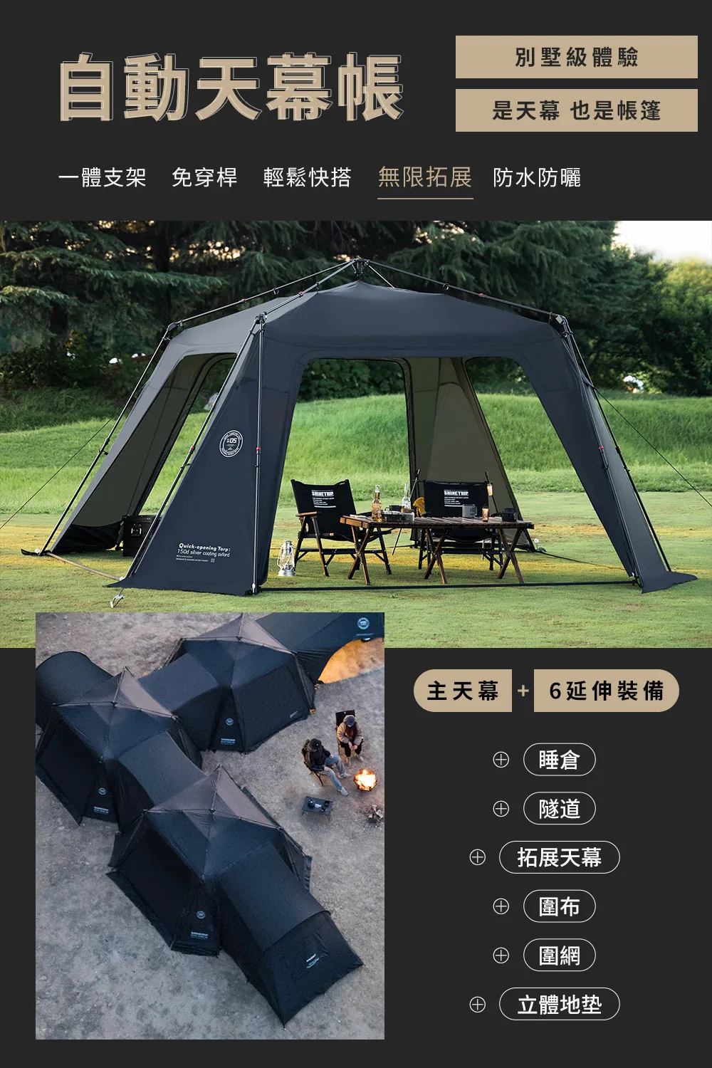 「自動穹頂天幕帳」解放你的露營時間與體力!只要像撐傘一樣往上一彈,就能瞬間搭好,收納同樣快速,秒開秒收,從此不再手忙腳亂。這不只是一頂帳篷,更是你的戶外小宅: