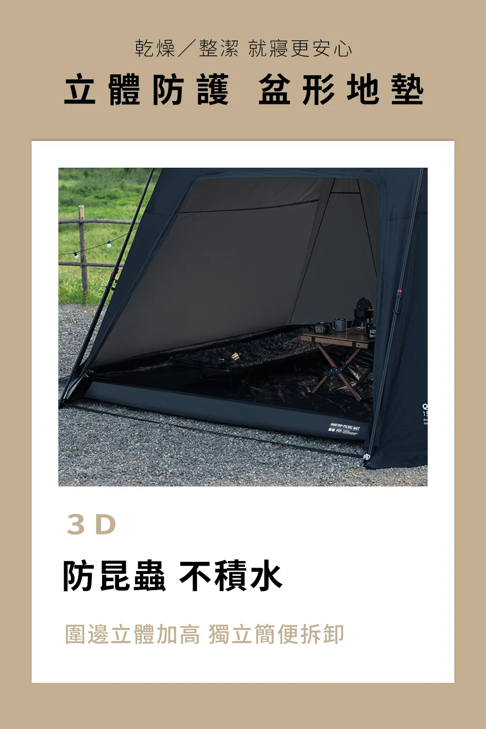 主帳PU2000mm防水、搭配浴盆地墊可完全防止積水滲透,暴雨天也能安心睡。